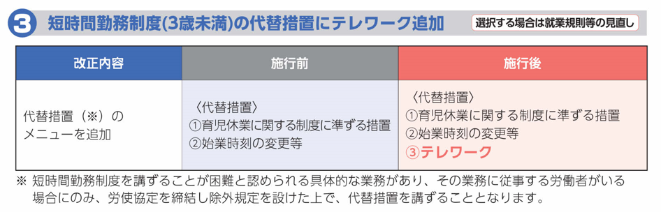 3. 短時間勤務制度(3歳未満)の代替措置にテレワーク追加(令和7年10月1日施行)