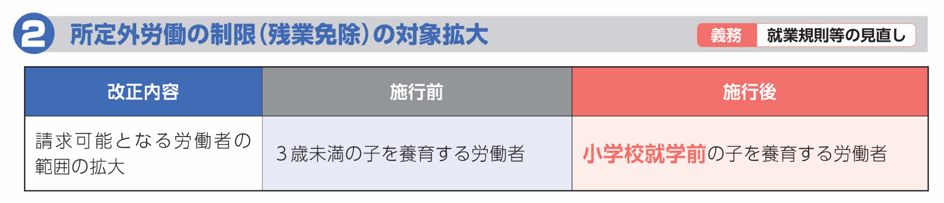 - 残業免除の対象が「3歳未満の子を養育する労働者」から「小学校就学前の子を養育する労働者」に拡大