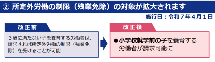 2 .所定外労働の制限 (残業免除) の対象となる労働者の範囲を、小学校就学前の子 (現行は3歳になるまでの子) を養育する労働者に 拡大する。