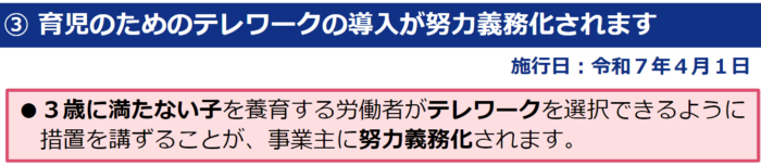 4 .3歳になるまでの子を養育する労働者に関し事業主が講ずる措置(努力義務)の内容に、テレワークを追加する。