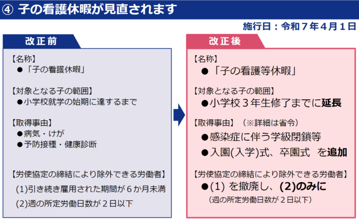 3 .子の看護休暇を子の行事参加等の場合も取得可能とし、対象となる子の範囲を小学校3年生(現行は小学校就学前)まで拡大するとと もに、勤続6月未満の労働者を労使協定に基づき除外する仕組みを廃止する。