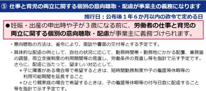 5 .妊娠・出産の申出時や子が3歳になる前に、労働者の仕事と育児の両立に関する個別の意向の聴取・配慮を事業主に義務付ける。